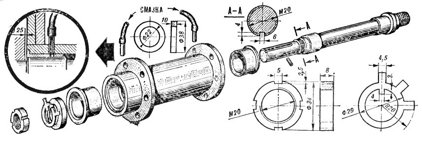 Рис.1. Общий вид самодельного токарного станка по дереву. С его помощью можно выточить много нужных деталей круглого сечения: колеса, оси, валы, рукоятки для инструментов. Начав с простых изделий, постепенно можно дойти до изящной точеной мебели, деталей парусных яхт и пр. Рис. 2. Самодельный токарный станок по дереву. Принцип работы на токарном станке прост: заготовке, зажатой в горизонтальном положении, сообщается вращательное движение и подвижным резцом снимается лишний материал. Но чтобы осуществить этот простой принцип, требуется механизм, состоящий из множества точно пригнанных деталей. И все же собрать такой станок своими руками вполне возможно. Задача упрощается, если есть возможность изготовить часть необходимых для него деталей на другом токарном станке. А если такой возможности нет то можно обойтись только слесарными работами, подобрав некоторые готовые стандартные детали. Сначала познакомьтесь с общим видом станка. Он показан на рисунках 1 и 2. На жестком основании 1, которое называется станиной, укреплены передняя бабка 5 и задняя бабка 2. Передняя бабка — неподвижная. Ее основной узел — вал- шпиндель 8. Он вращается в бронзовых подшипниках внутри неподвижно закрепленного корпуса 7. На шпинделе устанавливается приспособление для крепления обрабатываемой детали. В данном случае это вилка 9. Для зажима детали используются, в зависимости от ее размера и формы, также планшайба, патрон и другие приспособления. Шпиндель вращается от электрического двигателя 10 через приводной шкив 6. Задняя бабка станка может передвигаться вдоль станины и закрепляется в нужном положении. На одном уровне со шпинделем передней бабки в задней бабке установлен так называемый центр 11. Это валик с заостренным концом. Задняя бабка используется при обработке длинных деталей — тогда заготовка зажимается между вилкой шпинделя и центром задней бабки. Чтобы упростить и облегчить эту операцию, валик-центр делается подвижным. Приблизительно установив заднюю бабку, подают центр немного вперед или назад, вращая маховичок 12, и зажимают деталь с нужной точностью. Поступательное движение центра осуществляется с помощью механизма, называемого пинолью (см. рис. 4). Чтобы длинная деталь небольшого диаметра не изгибалась под нажимом резца, ее опирают на люнет 3, который по мере необходимости передвигаете» вдоль станины. В люнет вставляется смазанная машинным маслом втулка из твердой древесины. Диаметр отверстия втулки должен соответствовать предварительно обработанной шейке детали. В этой конструкции станка лишний материал снимается с вращающейся заготовки специальными резцами различной формы, которые токарь держит руками. Поэтому для удобства на нашем станке имеется подручник 4, на него опирается резец. Когда точат длинные детали, подручник передвигают вдоль станины и закрепляют против обрабатываемого участка. Высота подручника регулируется, чтобы удобно было работать резцами разной толщины. Для изготовления станка вам понадобится электрический двигатель мощностью 500 Вт или немного больше, с частотой вращения до 3000 мин-1. При работе на станке требуется различная частота вращения шпинделя — она зависит от диаметра обрабатываемой детали и твердости древесины. Мягкая древесина допускает обработку при больших оборотах, твердая — при меньших. Ес